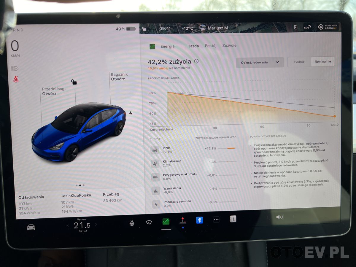 Co ciekawe, w przypadku zużycia energii potrzebnej na samą jazdę Tesla przegrywa z MG4. Nasz Model 3 potrzebował 2 kWh więcej. Wynika to zapewne z większej masy pojazdu (100 kg różnicy)