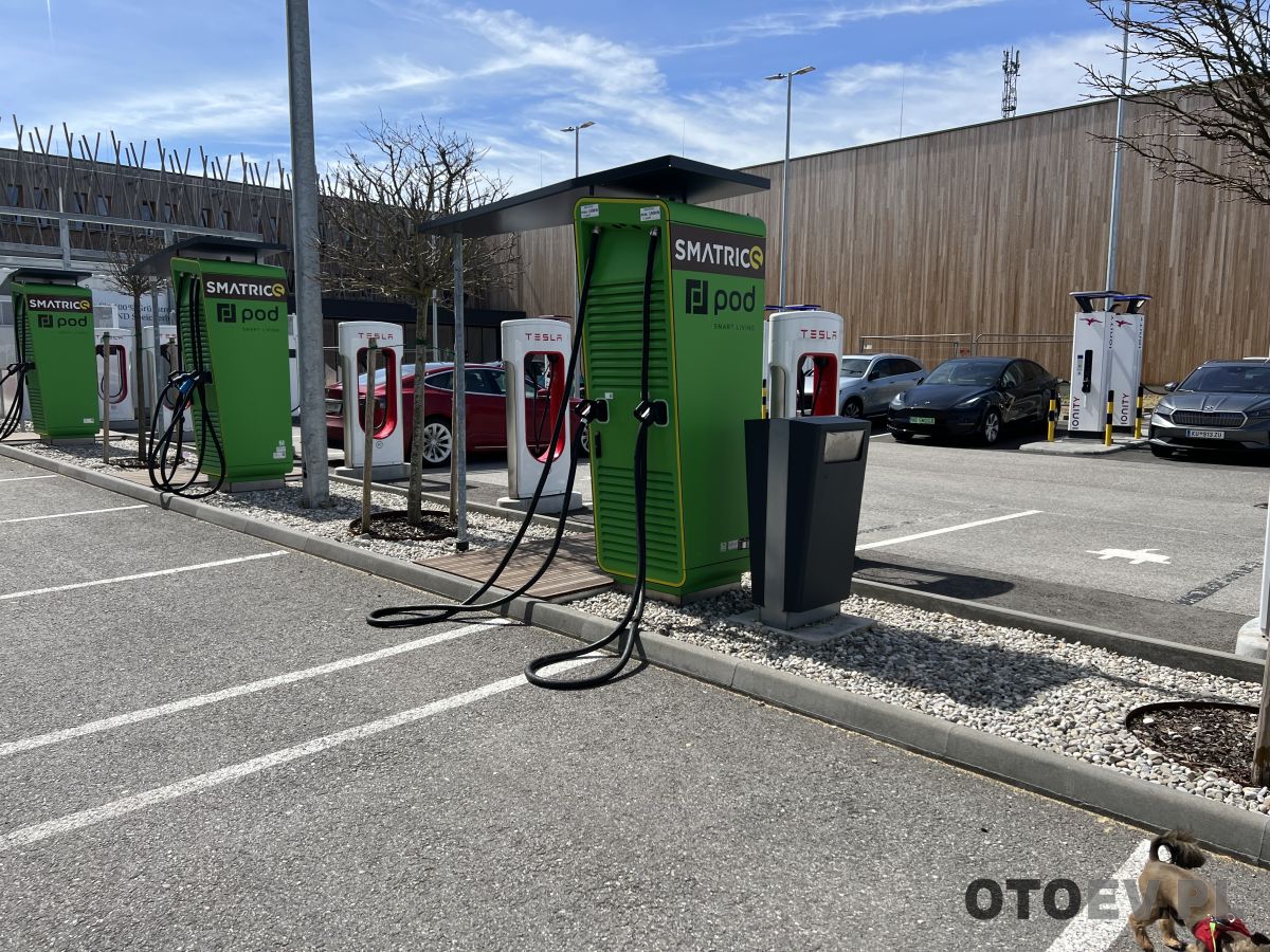Mamy Supercharger Tesli w liczbie 8-12 stacji, lub nawet więcej. Obok lokalna sieć która postawiła stacje od 50 do 150 kW mocy w liczbie na przykład 12 sztuk. Mamy również słupki AC w liczbie 12 sztuk, dla osób nocujących w pobliskim hotelu.
