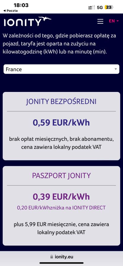 Francja ma bardzo dobre stawki, bo zaledwie 0,59 euro i tylko 0,39 euro po uwzględnieniu rabatu IONITY PASSPORT. 0,39 euro to zaledwie 1,69 złotego, więc naprawdę bardzo tanio jak na tą akurat sieć.