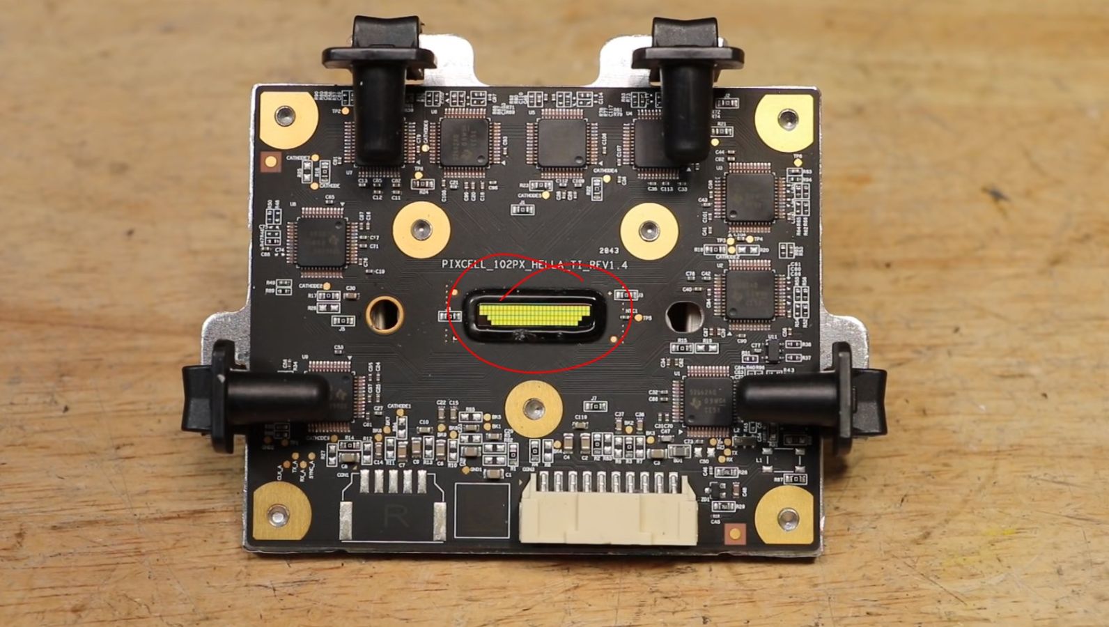 W każdym nowym reflektorze Tesli znajdują się 102 maleńkie diody LED, łącznie o szerokości zaledwie 2 cm. Taki paseczek. Mamy Również kilka soczewek, które bardzo precyzyjnie sterowane elektroniką tworzą wiązki światła.