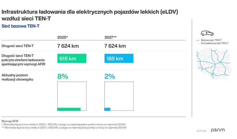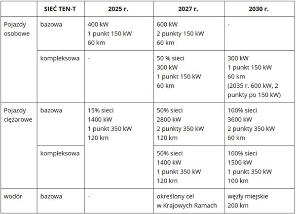 Jak poinformowało Polskie Stowarzyszenie Nowej Mobilności, w najbliższej perspektywie AFIR przewiduje m.in. konieczność rozmieszczenia maksymalnie co 60 km wzdłuż sieci bazowej TEN-T stref ładowania (każda o łącznej mocy co najmniej 400 kW, a do 2027 co najmniej 600 kW) na każdym kierunku podróży.