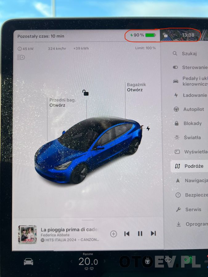 Koniec ładowania to poziom 90% SOC, pozwalający kontynuować komfortowo dalszą podróż, godzina 13:38, czyli dokładnie 21 minut później. Naprawdę szybko!