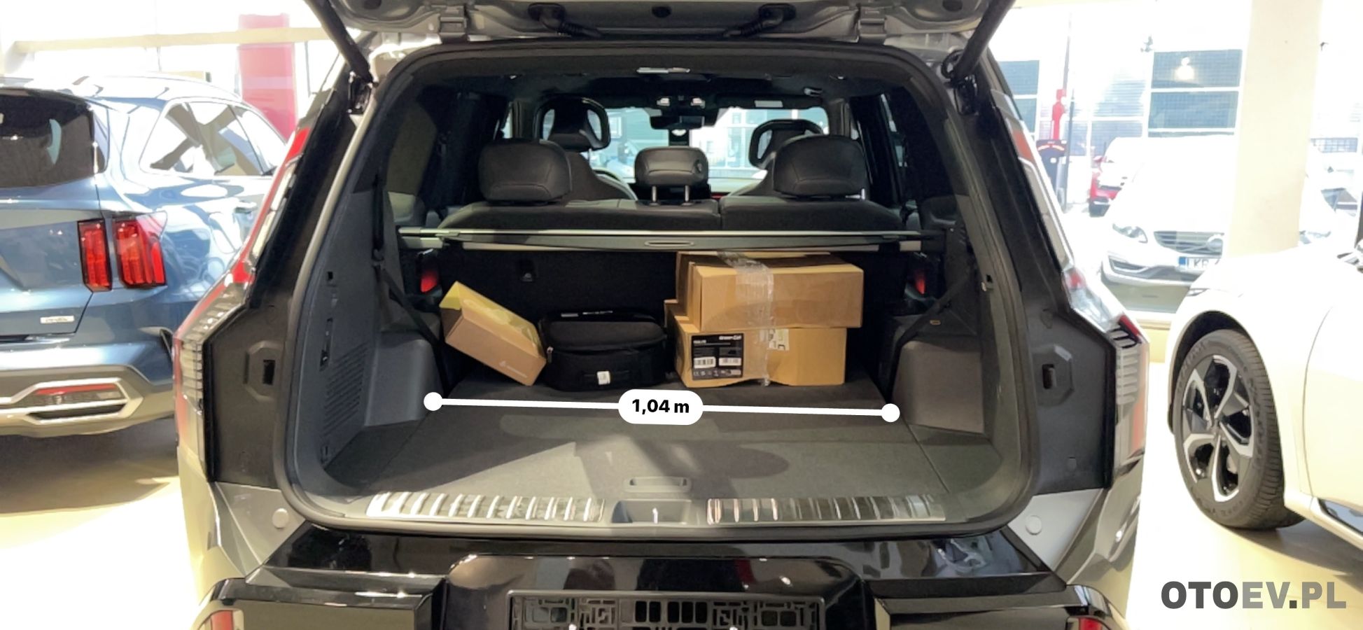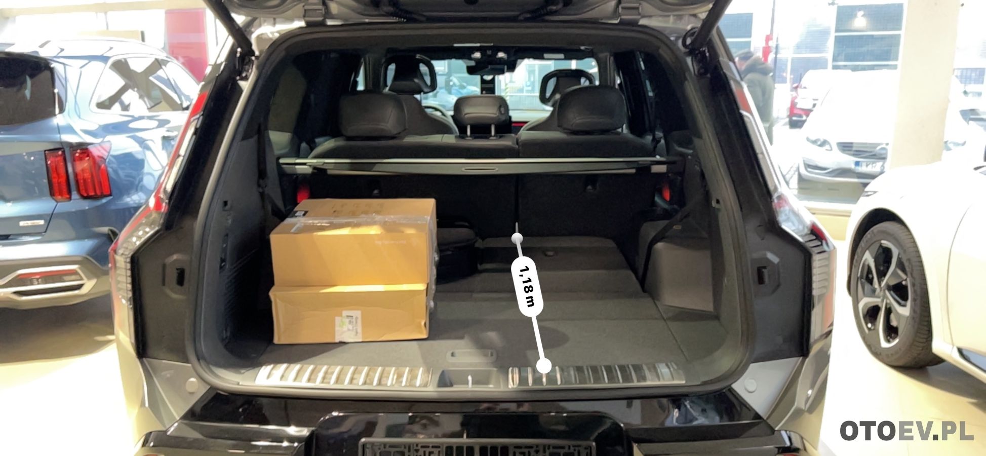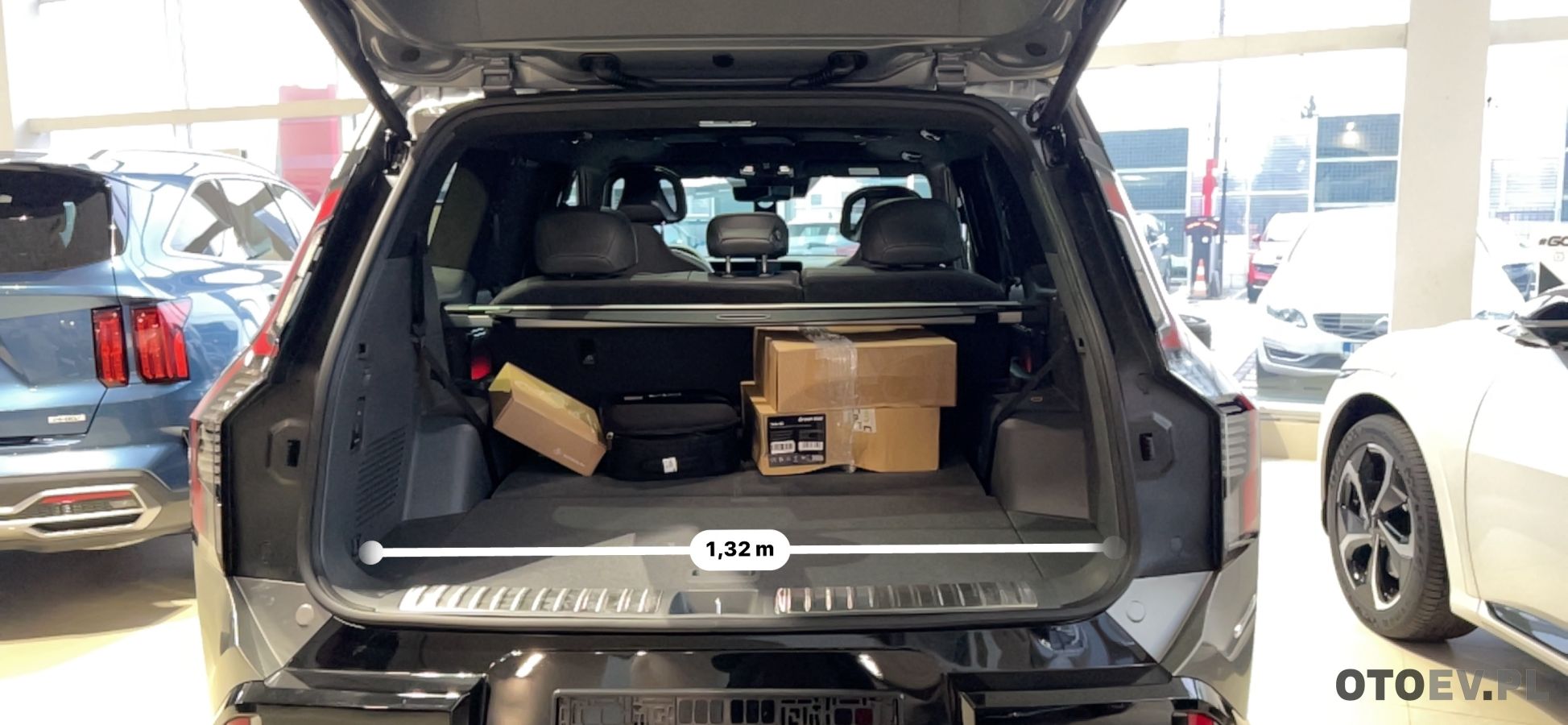 Co mi się podoba w tym aucie, to właśnie przestrzeń. Mamy w Kii EV9 wersje 6 oraz 7 osobowe, jednak po złożeniu trzeciego rzędu siedzeń, bagażnik po prostu rośnie w oczach. Jest ogromny a wymiary możecie zobaczyć poniżej.