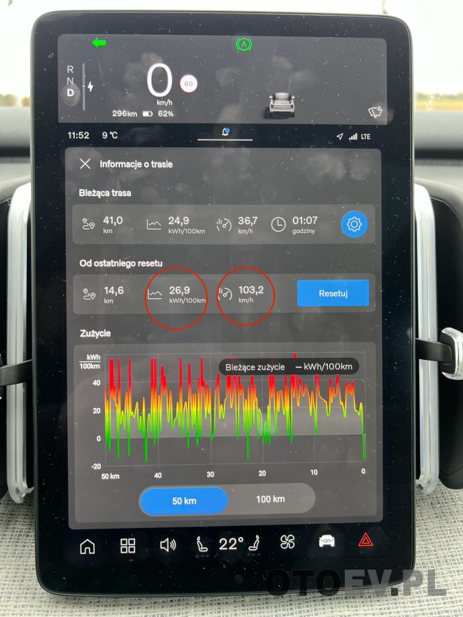 Tutaj wynik okazał się jeszcze wyższy, bo potrafiłem uzyskać nawet 30 kWh na 100 km a średnie zużycie okazało się nieco niższe i wyniosło 27 kWh na 100 km (średnia zaś zaraportowana przez samochód prędkość nieco tylko przekroczyła 100 km/h). Niestety tak jak wcześniej wspomniałem przy takiej pogodzie każde auto elektryczne, będzie zużywało znacznie większej ilości energii niż w warunkach optymalnych temperatur jakie panują w okresie wiosenno-letnim.