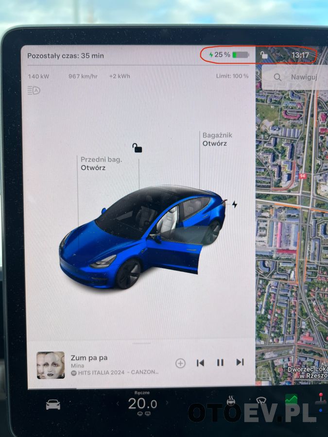 Jak już wspominałem we wcześniejszych tekstach na temat tego auta, kiedy przygotowałem baterie w odpowiedni sposób udało mi się w ciągu zaledwie 21 minut naładować trójkę od 25 do aż 90% SOC, i to na stacji której maksymalna moc wynosi 140 kW.