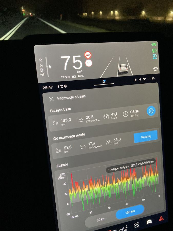 Niestety, już wtedy pogoda nie rozpieszczała, bo temperatura oscylowała w okolicach zera stopni Celsjusza (ale z drugiej strony…osoby 40+ pamiętają, że to raczej nie jest zima…a raczej jesień?). Wiatru nie przyuważyliśmy albo nam zbytnio nie przeszkadzał. W każdym razie, mapka w aplikacji ABRP (A Better Route Planner) wskazała dokładnie gdzie wypadałoby się zatrzymać na przystanek połączony z ładowaniem. Wyszło, że przy A4 w Brzegu.